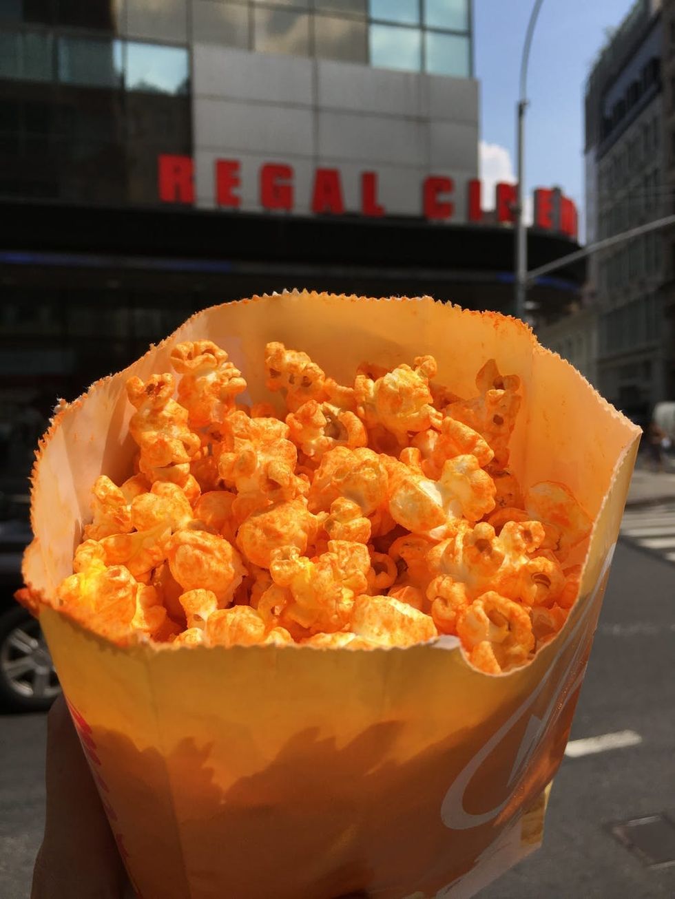 We’ve been drooling over Cheetos Popcorn since we heard it was available at participating Regal Cinemas in 32-ounce bags. Cheetos AND cheese-dusted popcorn?! Seemed too good to be true. We headed to our local Regal Cinema in NYC to get a first bite of Cheetos Popcorn ($8, a nationwide rollout starts December 15), without seeing a movie, because apparently you can do that. Here’s what we thought.
