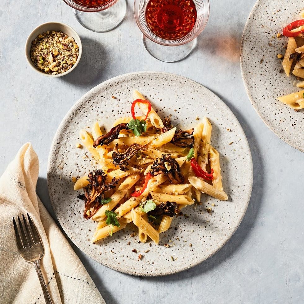 Creamy Lentil Penne with Mushrooms, Pickled Chilies & Hazelnuts
