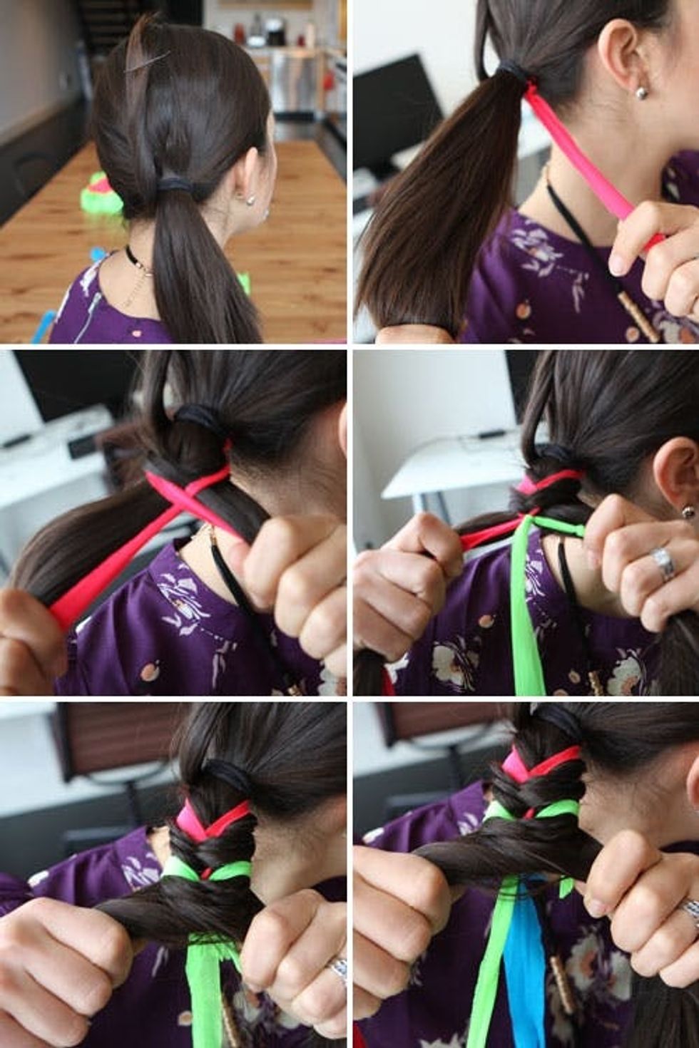 6. Pick up the second set of colored strands and tie them to the first set that should now be in the center of your 2 sections of hair.