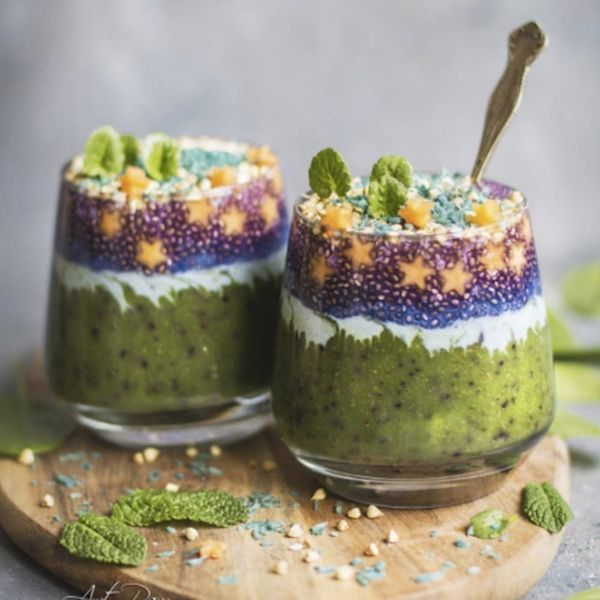 2. Shining Star: Be a beacon of health by starting your day off with this chia creation. It’s made with coconut yogurt, chia seeds (duh!), papaya stars, spinach, banana, and blueberries.
