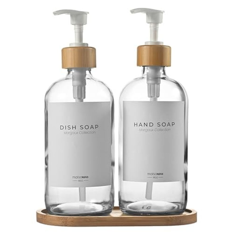 Spruce up your countertops with a set of Glass Soap Dispensers. Say goodbye to generic soap packaging by opting for these reusable, stylish dispensers. Complete with a bamboo tray to keep them organized, and labeled to differentiate between dish and hand soap, this set combines functionality with aesthetic appeal.