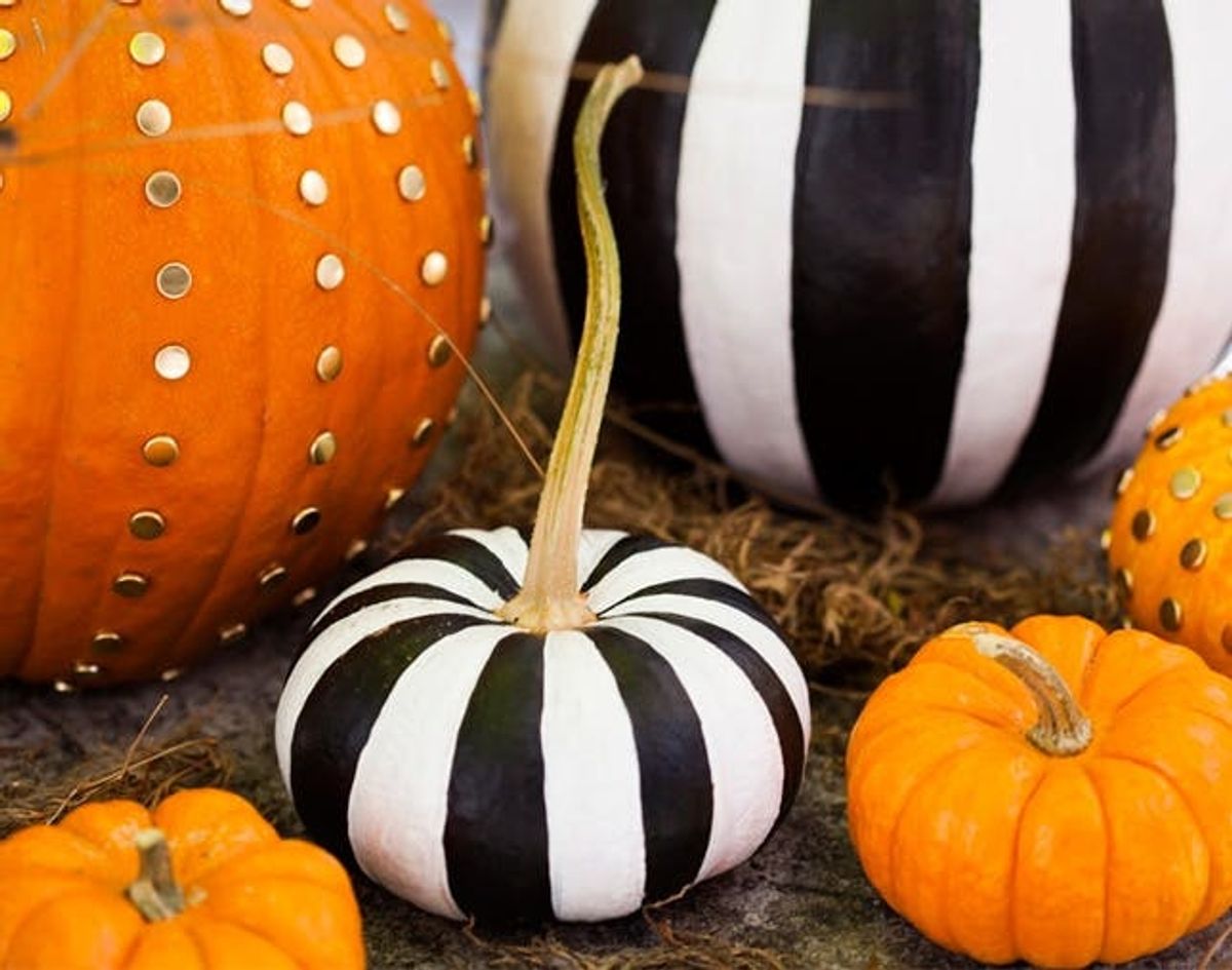 For this week’s chic take on pumpkins, we turn to two of our favorite DIY tricks: stripes and studs! By combining black and white stripes with gold polka dots (by way of studs), we’ve created a suite of pumpkins chic enough for the most sophisticated of soirees.