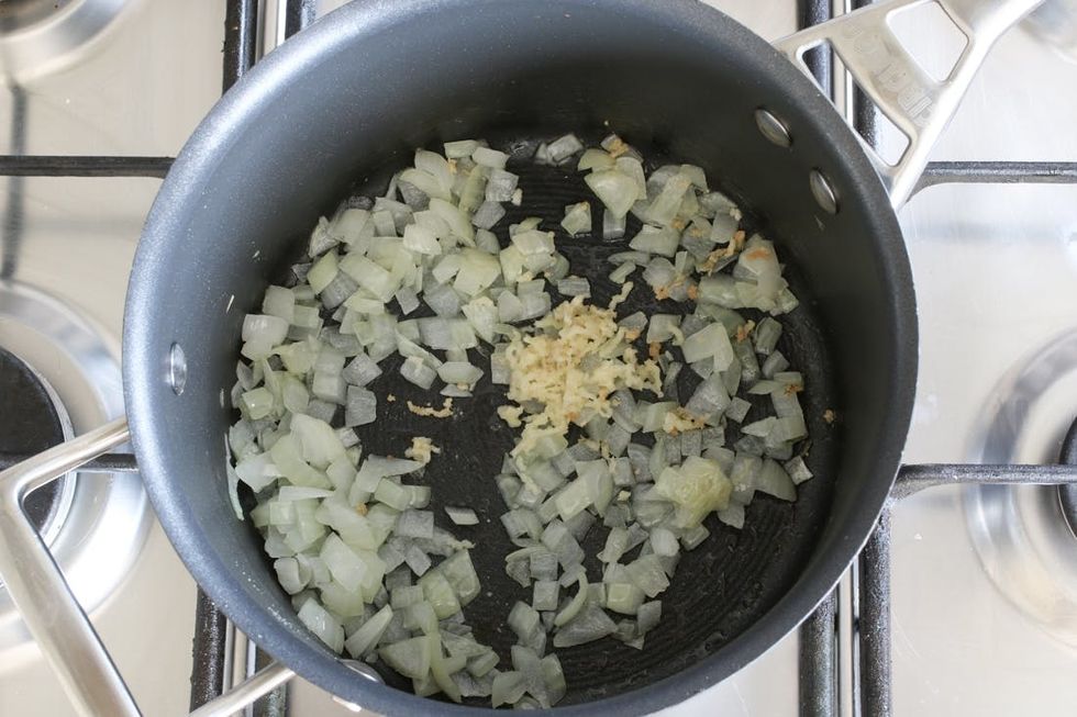 Heat the oil in a large saucepan and cook the onions on medium heat for 4-5 minutes, until they start to soften. Add in the garlic and stir. Cook for one minute.