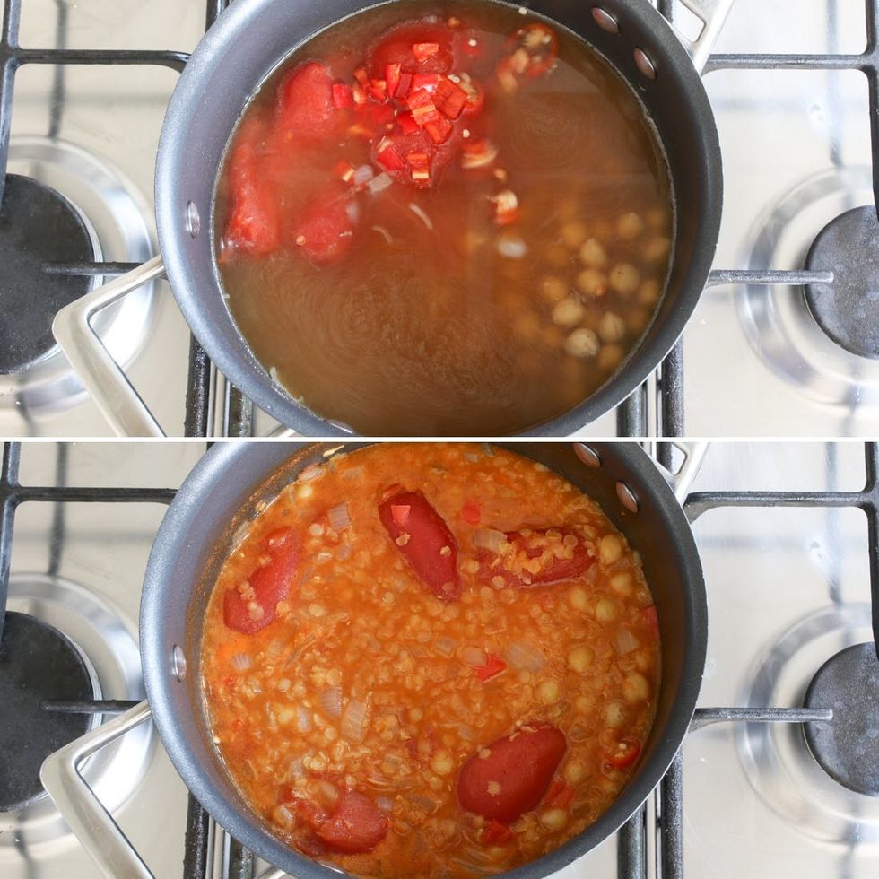 Add the lentils and stir to coat them in the oil. Add in the stock, canned tomatoes, chickpeas and chopped chiles. Stir, then bring to gentle bubble. Simmer for 15-20 minutes until the lentils are tender.