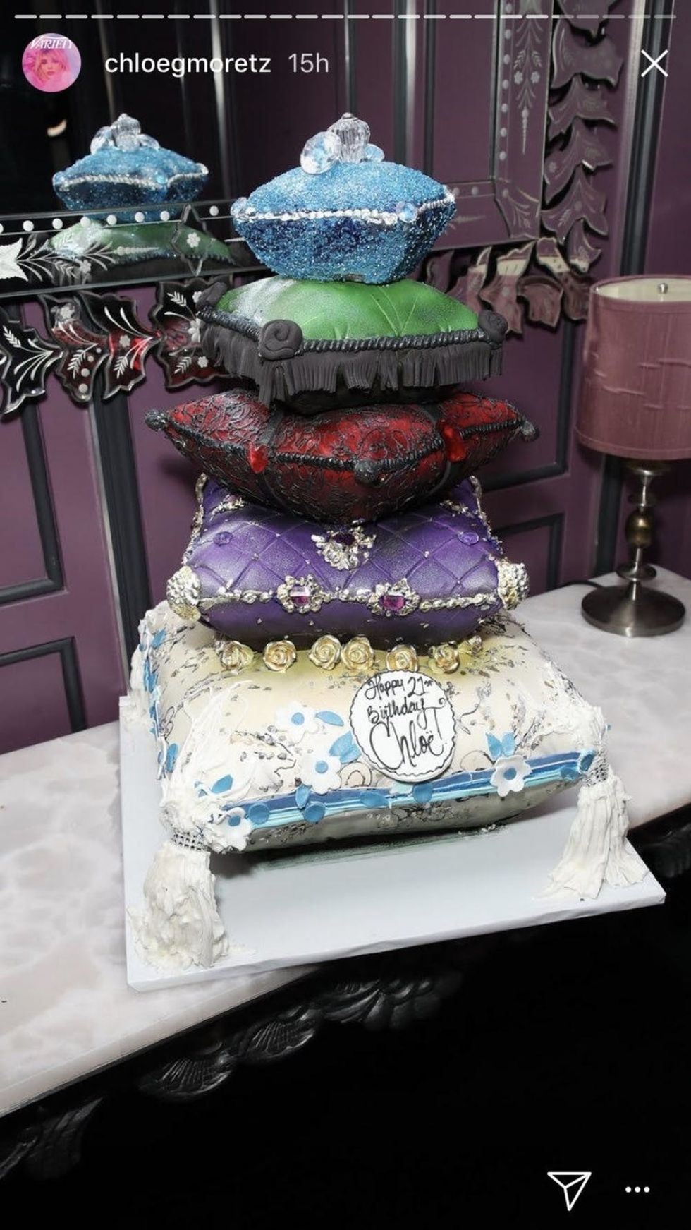The blonde beauty opted for an opulent wedding-worthy cake for her birthday bash, which she held on Saturday, Feb 3. The sweet treat featured five glamorous, jewel-toned cushions (made from what appears to be fondant) stacked on top of each other, plus a white chocolate medallion with the words, “Happy 21st Birthday Chloë!” scrawled on it.