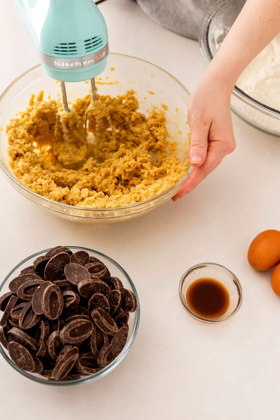 4. Invest in the Chocolate: Torres is skeptical of chocolates that don’t melt — like chips, for instance. His advice? Find a high-quality chocolate with lots of cocoa butter, so that the chocolate melts and oozes as it bakes. For this recipe, Torres recommends his baking disks, which are sold online. If you’re in a pinch, Valrhona fèves, or oval-shaped chocolate pieces, are at available at Whole Foods. That’s what we used for this recipe. Torres also says that what makes his cookie so good is that “there’s more chocolate than dough,” so remember: Pour those disks in liberally!