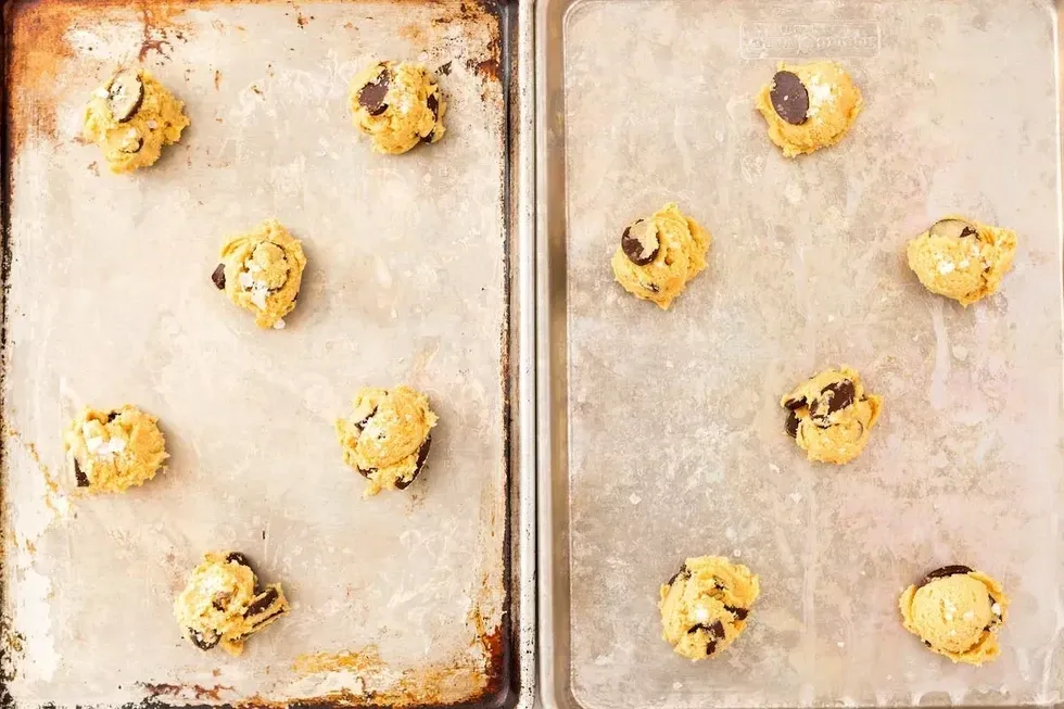 8. Scoop 6 (3 1/2-ounce) mounds of dough (the size of generous golf balls) onto baking sheet, making sure to turn any chocolate pieces that are poking up back horizontally; it will make for a more attractive cookie.