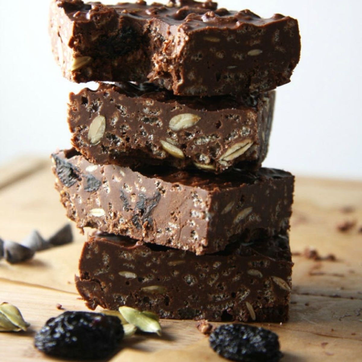 Over at 24 Carrot Life, Katie is showing us that you can live a decadent lifestyle while still eating healthy. Her chocolate & peanut-butter fudge squares are a vegan treat. She uses dried cherries in her bars, but you could just as easily substitute raisins if you have them on hand.