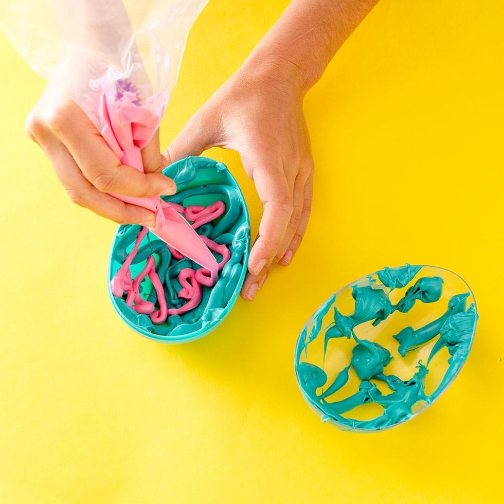 Spoon melted chocolate into piping bags and create a swirly pattern on each plastic egg shell.