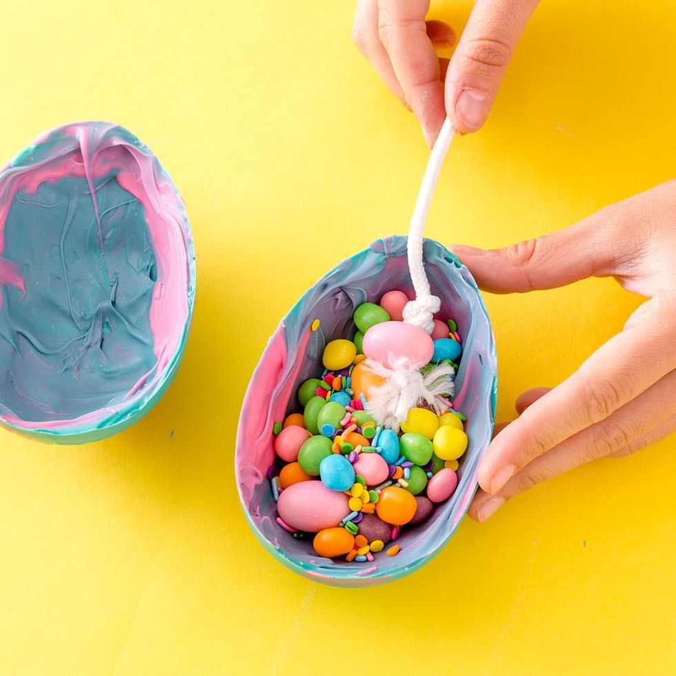 - Pop the chocolate molds out of the plastic shell and fill with candy. Lay a knotted rope at the top of the egg to prepare for hanging.