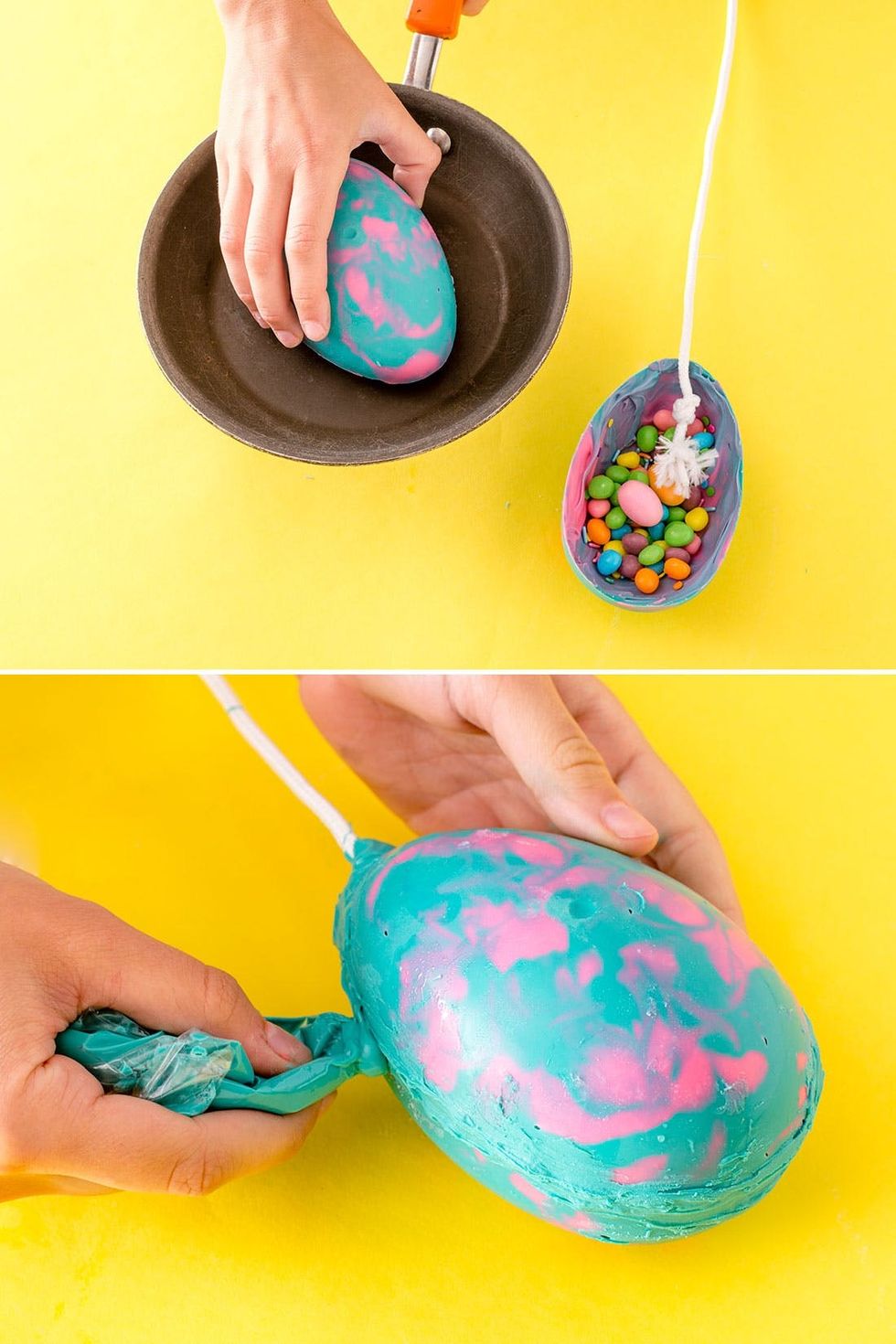 - Heat up a pan and press the edge of one egg to the hot surface. Quickly attach the egg halves together to create your full egg piñata. Use leftover chocolate from the piping bag to seal the egg piñata tightly.