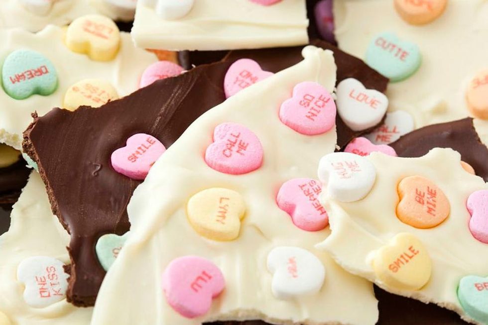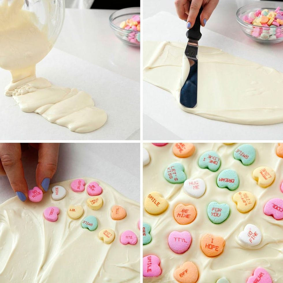 Melt the white chocolate according to the directions above. Pour the melted white chocolate onto wax paper. Spread to an even thickness. Sprinkle conversation heart candies on the chocolate.
