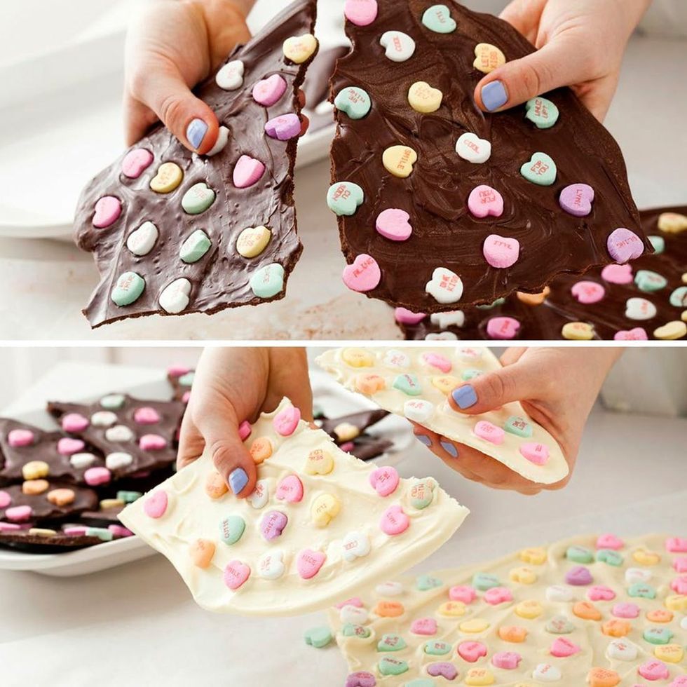Melt the semisweet chocolate according to the directions above. Pour the melted semisweet chocolate onto wax paper. Spread to an even thickness. Sprinkle conversation heart candies on the chocolate.