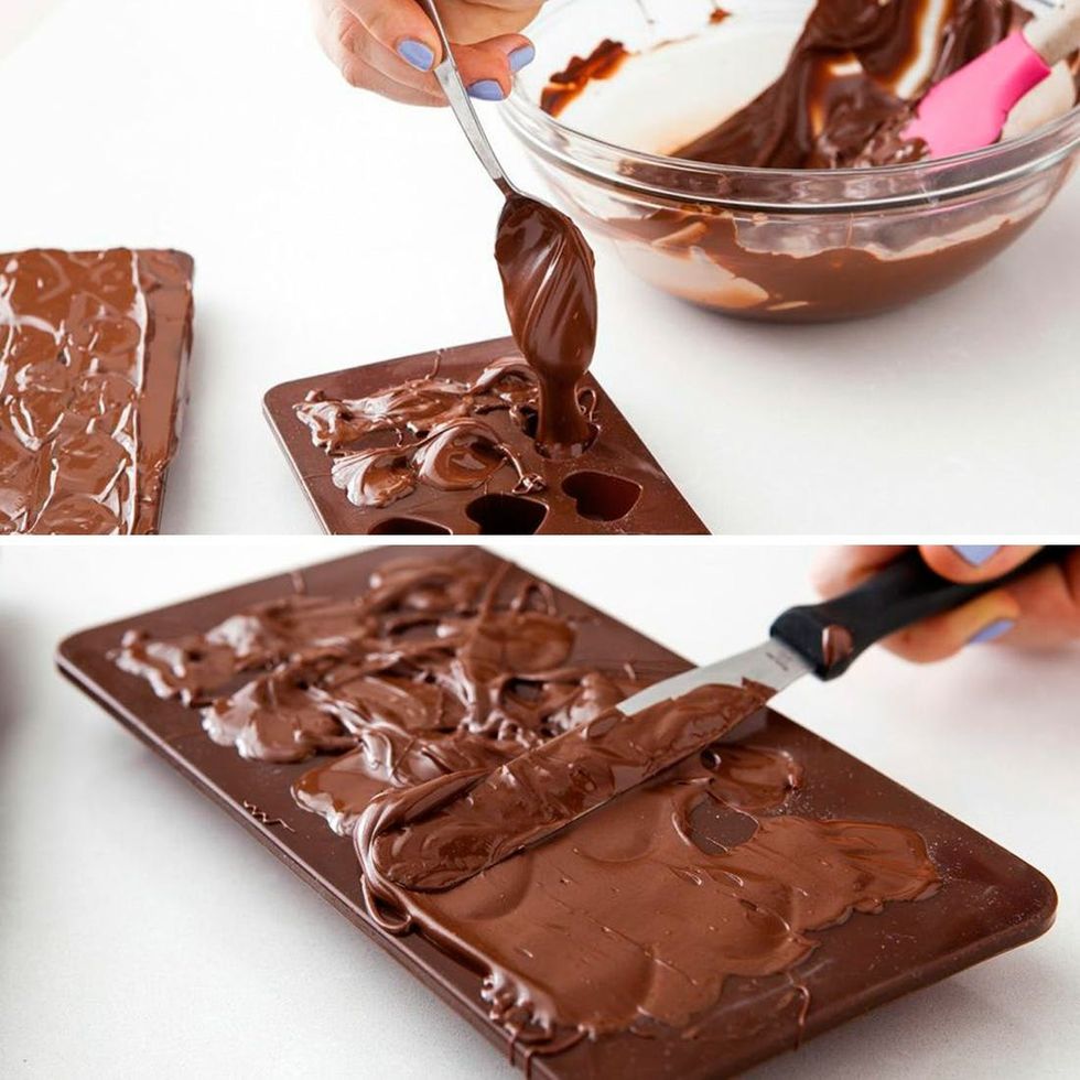 2. Pour or spoon the melted chocolate into your silicone mold. Using an offset spatula, smooth the chocolate across the mold. Refrigerate for 30 minutes, or until firm. Pop out your heart chocolates.