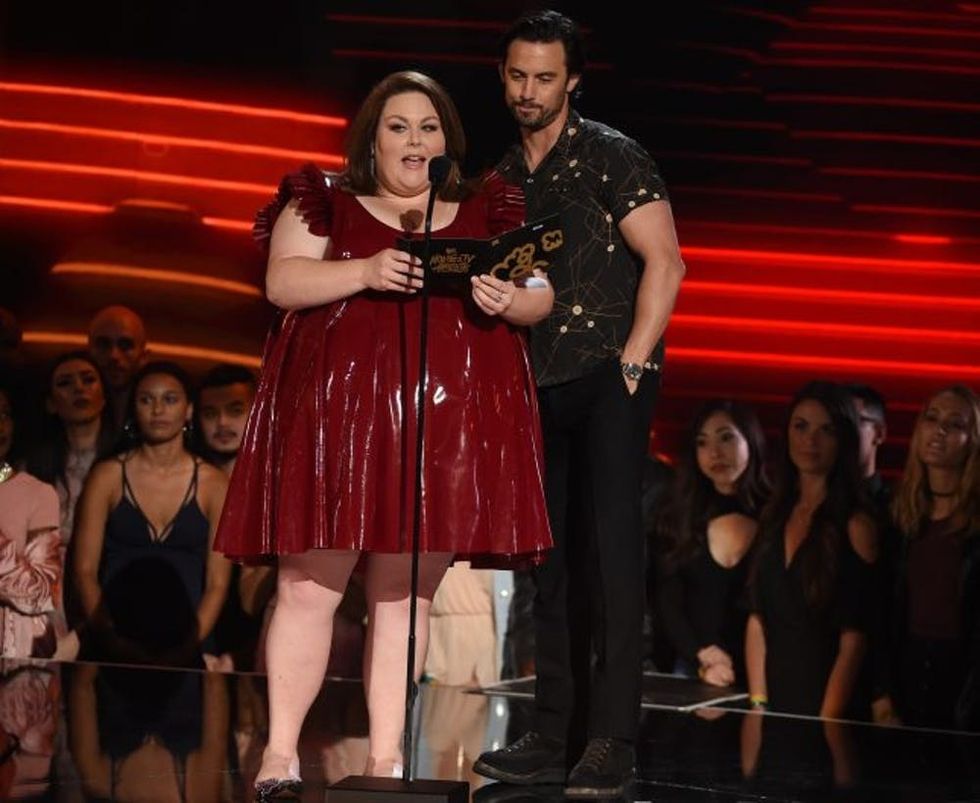 This Is Us star Chrissy Metz stepped out onto the stage last night in a stunning red latex mini dress with ruffled accordion sleeves and a pair of black flats with co-star Milo Ventimiglia to announce Best Duo.