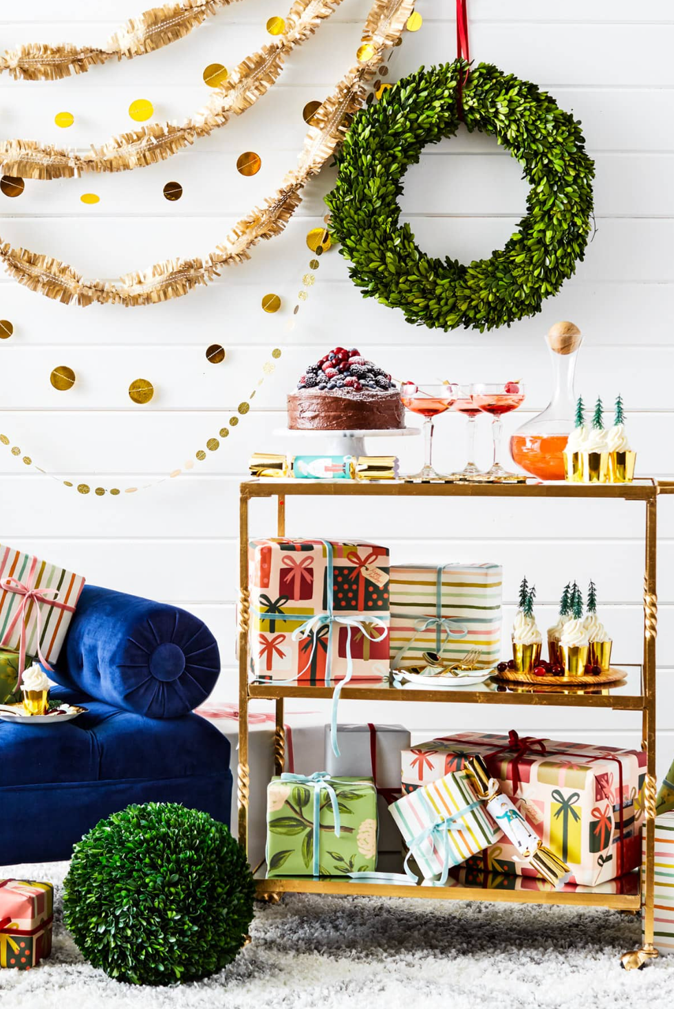It doesn’t get much more festive than a bar cart full of presents and gold barware. Layered garlands and mini bottle brush trees create punchy decor accents for any holiday get-together. (via Sugar & Cloth)