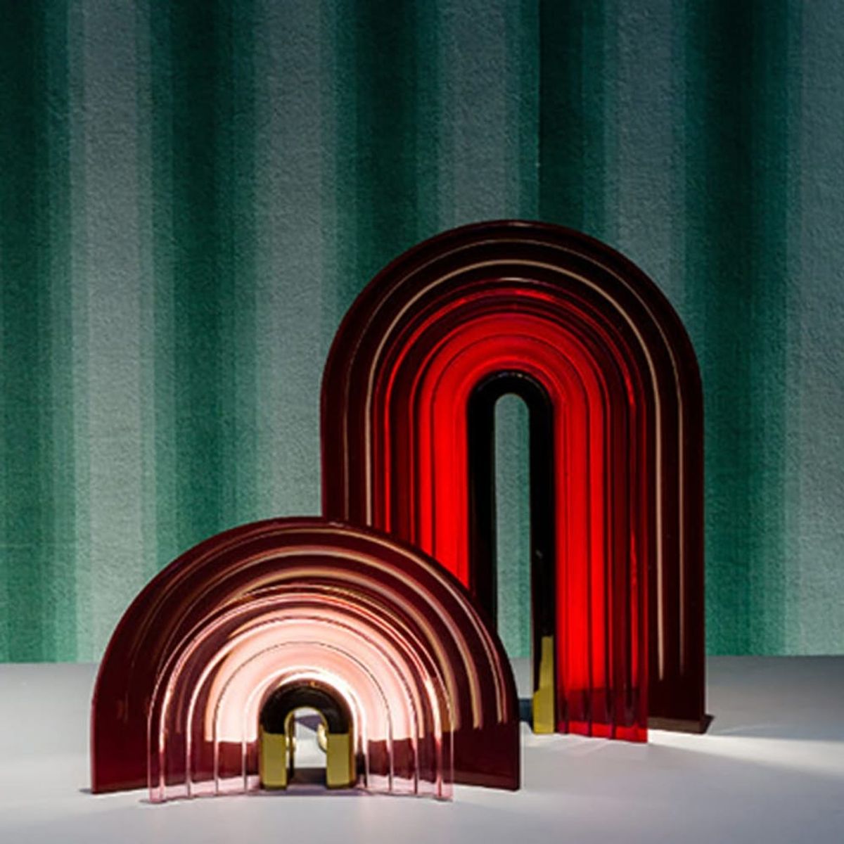 Each sculptural table lamp is comprised of a large colored glass piece and a set of curved glass pipes wrapped around a central metal U. A neon tube is hidden at the center in coordination with LED lights at the base of the glass pipes, creating a gorgeous rainbow-shaped glow. The best part? The glass pieces are modular and can be mixed and matched with other colors to have a more multi-dimensional/multi-mood look and feel.