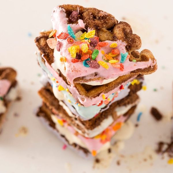 Hi guys! Cassidy here, with a very important PSA. We’re no stranger to a great food hybrid at Brit + Co — from sushi donuts to s’mores fries, we’ll try anything. This week at the office, we combined two glorious foods into the most decadent, delicious sweet treat. Churros and waffles came together in the best way possible and created the churro waffle ice cream sandwich! I mean come on, so much goodness in one recipe! It’s the perfect dessert to serve this summer.