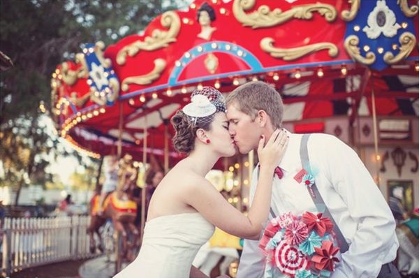 6. Engagement Photo Shoot: This couple didn’t want a themed wedding. Instead, they went all out with a circus-themed engagement shoot with incredible vintage props and costumes. (via Green Wedding Shoes)