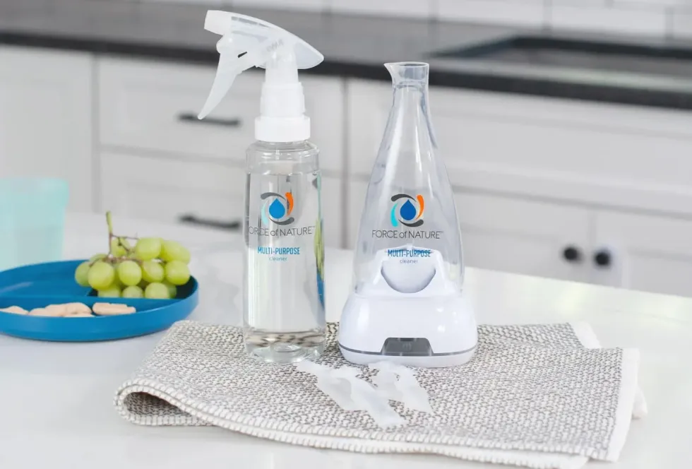 I discovered Force of Nature when I became a mom and was desperate for something that could disinfect a rubber changing pad without using products harmful to babies. Here's how it works: You buy a starter kit that includes a small machine, a reusable spray bottle, and capsules. You fill the appliance with water and squeeze in a capsule that is made up of salt, water, and vinegar. The appliance uses an electrical current to break apart molecules of these ingredients and create electrolyzed water — more specifically hypochlorous acid: an antimicrobial used in wound healing that kills 99.9% of germs with a small splash of sodium hydroxide: a compound that dissolves grease and grime (at low levels of concentration like these it is used in toothpastes).