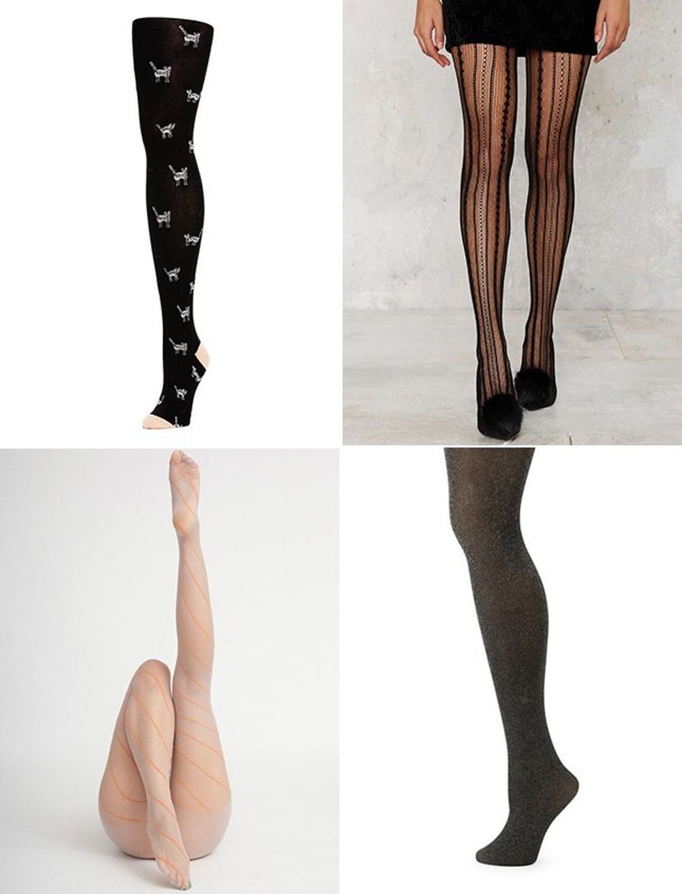 Hansel from Basel Alley Cat Tights ($34), Nasty Gal Put a Pinstripe in It Tights ($18), American Apparel Sheer Spiral Pantyhose ($14) + Hue Metallic Tights ($18)