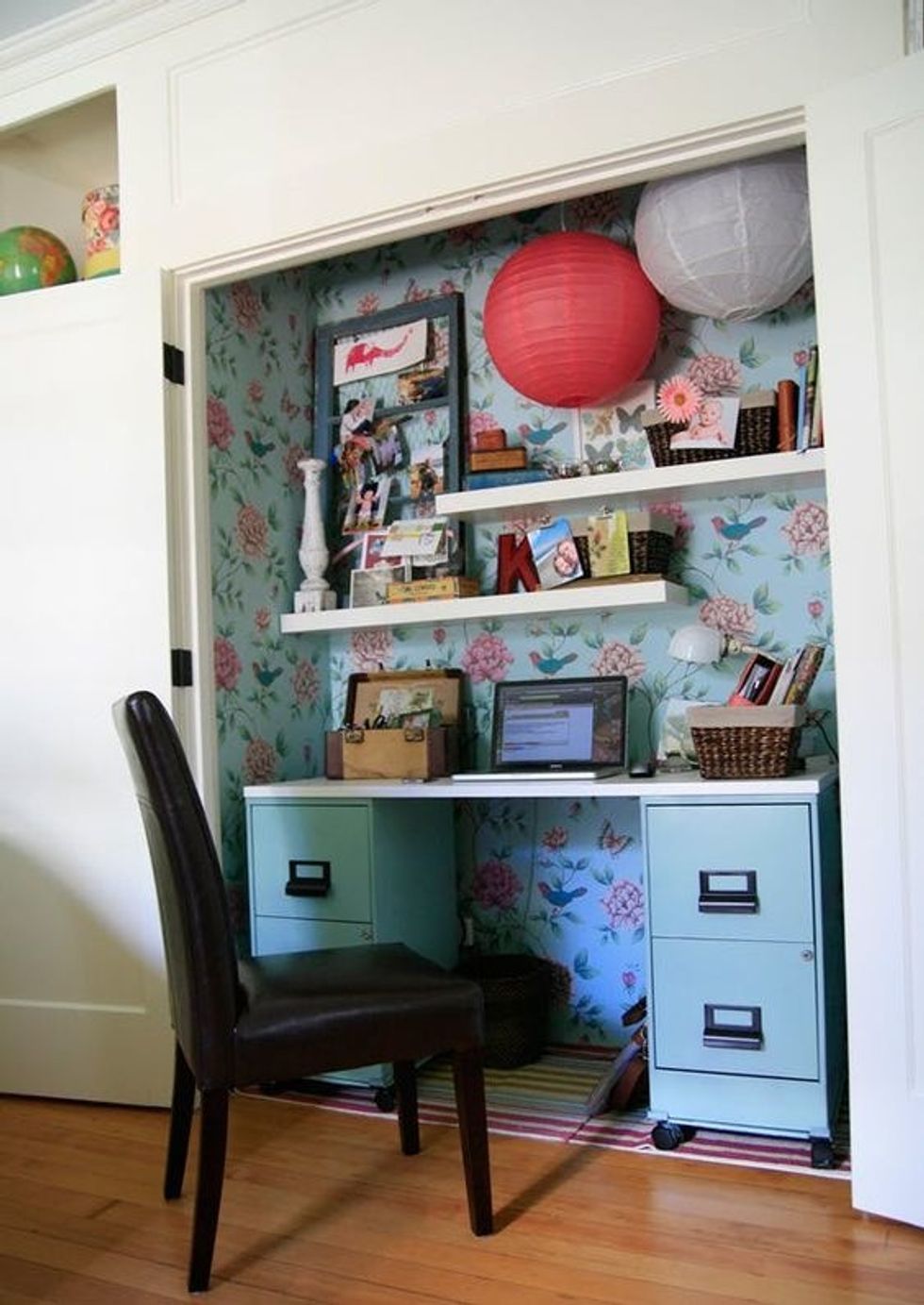1. Organization Space: Maybe all you really need is the space to get your papers organized. Put a file cabinet and some pretty boxes into a closet to give yourself easy access to organization. (via Dans le Lakehouse)