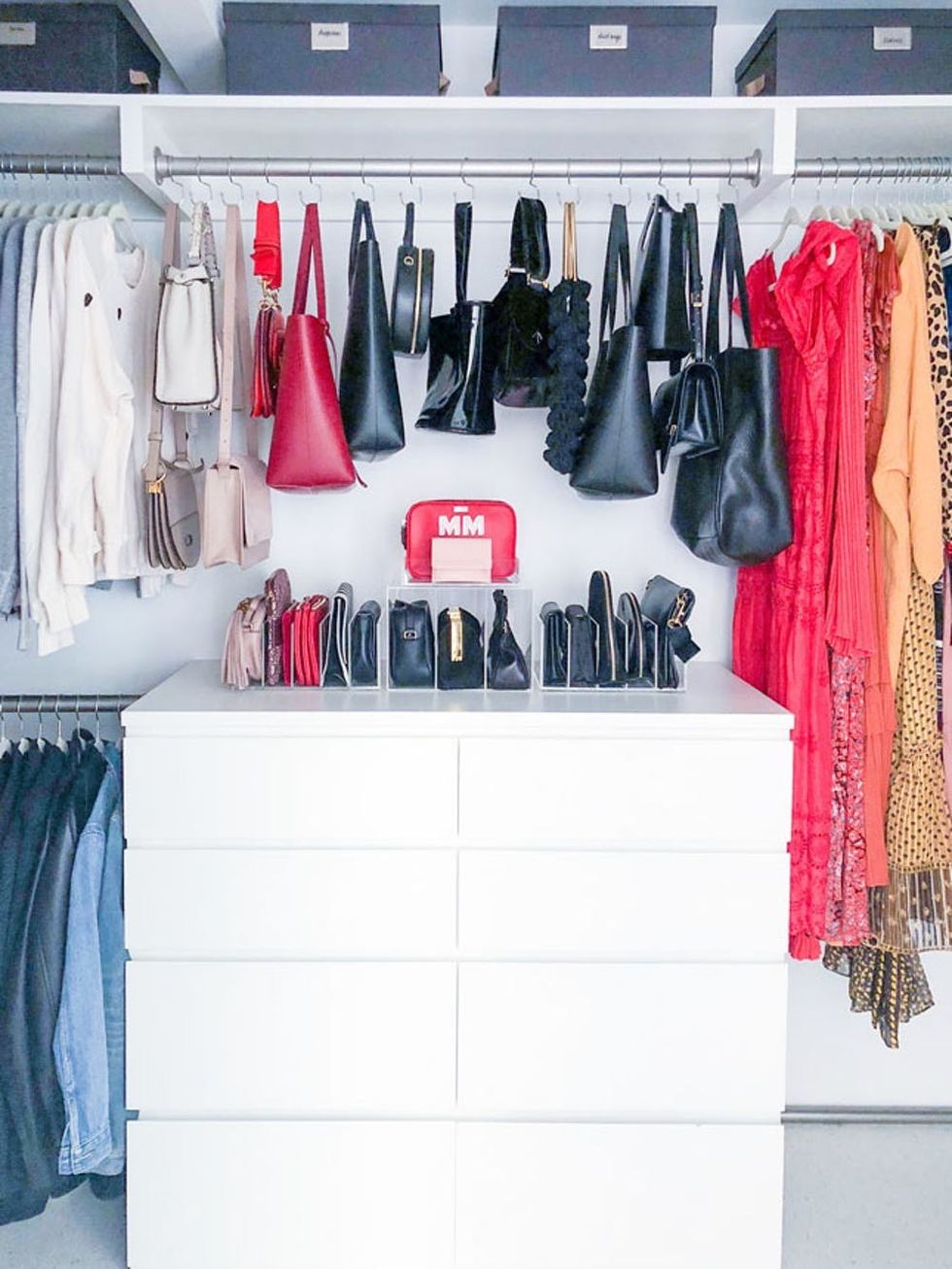 5. Display your most functional pieces. The Home Edit team recently worked with Mandy Moore, fine-tuning her closet and putting her handbags front and center in the closet. “We decided to make the most of Mandy’s hanging space and crafted a gorgeous bag station in the center of her closet by hanging her bags on tote hangers,” Shearer explains. “This became the style centerpiece of the closet while giving her ‘grab-n-go’ functionality.” And while you’re taking advantage of your closet’s vertical space, there’s one thing you should definitely keep around. “A step stool inside or near the closet makes bins easy to access,” Shearer adds.