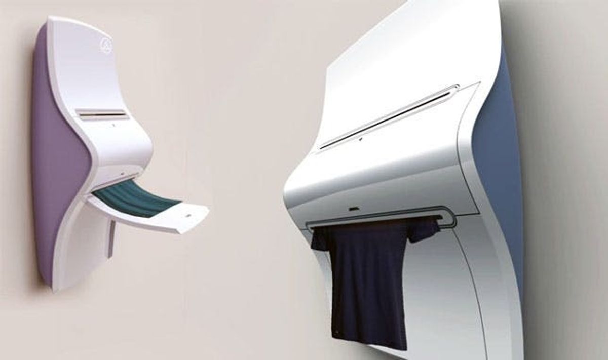 3D printing thing to a whole new level. This concept would bring clothing production into the home, potentially eliminating the need for closets, washing machines and dryers, thus saving space for folks who live in cities. Plus, it would obviously give you MASSIVE cool points any time a friend came over.