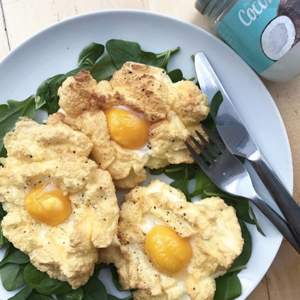 3. Simply Fresh: Though cloud eggs may *look* fancy, they’re actually pretty easy to make. You’ll separate your yolks from your whites, fluff the whites until they form peaks, and bake the whites in your oven, leaving a tiny hole in the middle. After the whites have started to harden, add the yolk and pop them back into the oven until the yolks are lightly cooked.