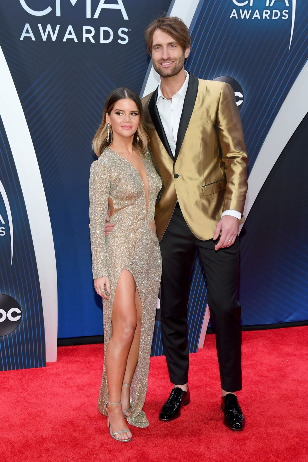 Maren Morris and Ryan Hurd: Morris, who's nominated for Female Vocalist of the Year and Musical Event of the Year (for the song "Dear Hate," featuring Vince Gill), glittered in gold on the red carpet. Her husband, whom she married in March, wore a matching gold tux jacket. (Photo via Jason Kempin/Getty Images)