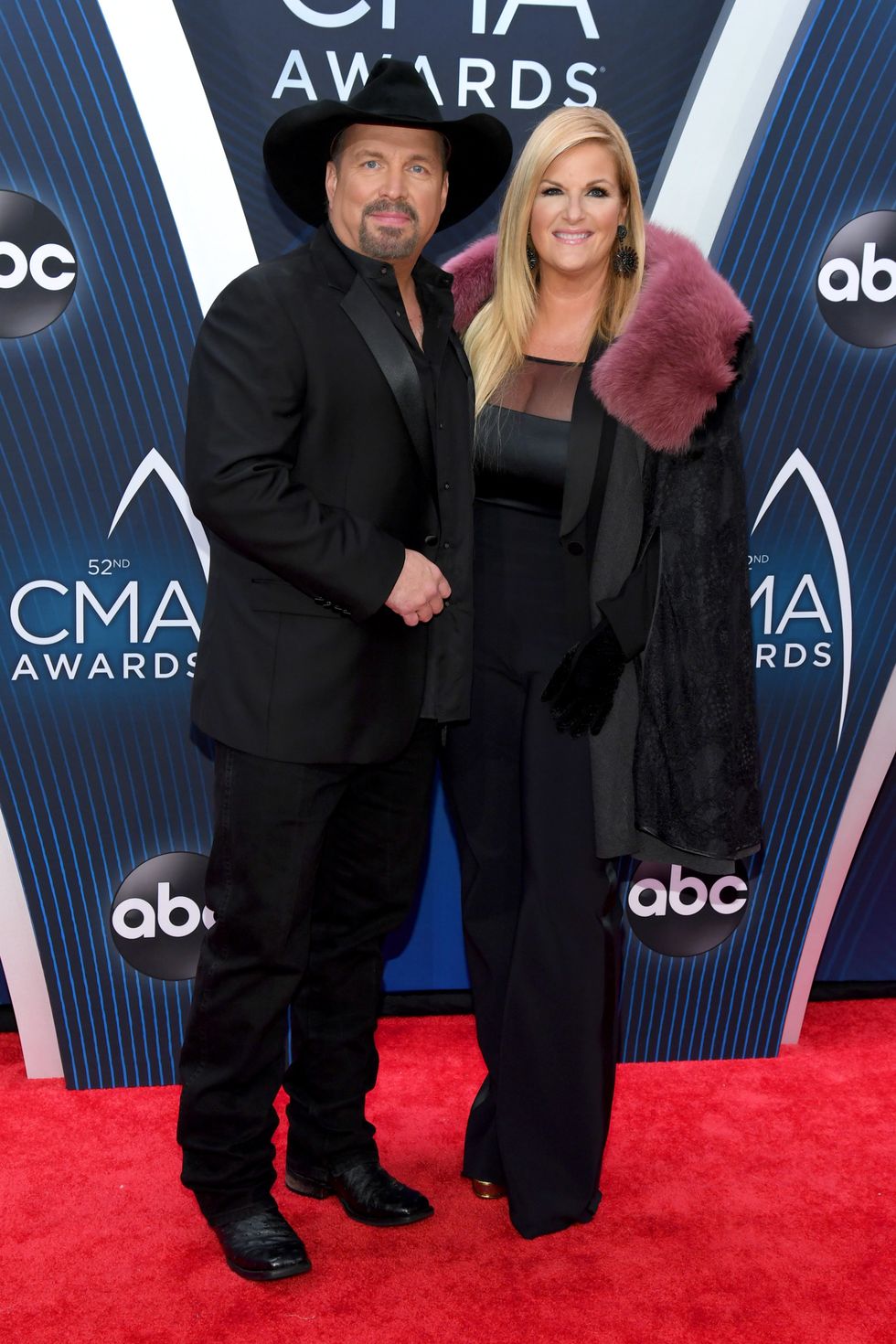 Garth Brooks and Trisha Yearwood: The country music power couple, who have 17 CMA Awards between the two of them, bundled up in black on the red carpet. Brooks is set to perform a special song dedicated to Yearwood during the show. (Photo via Jason Kempin/Getty Images)