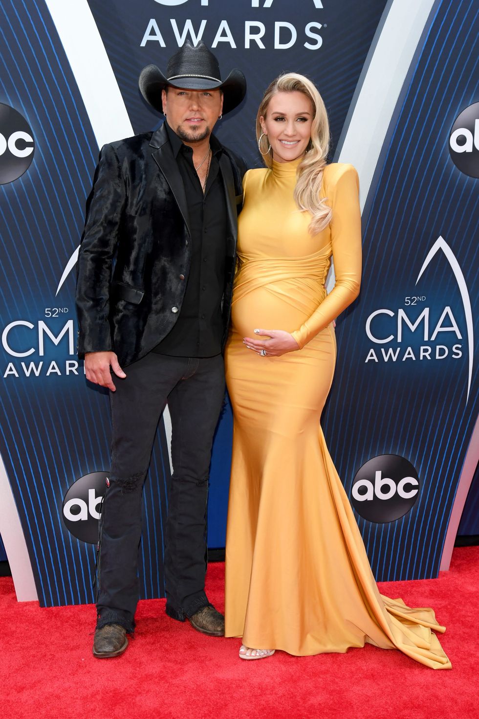 Jason Aldean and Brittany Kerr: The "Drowns the Whiskey" singer, who earned nominations in four categories, including Entertainer of the Year and Single of the Year, walked the red carpet with his pregnant wife, who stood out in buttercup yellow. The couple are expecting their second child together. (Photo via Jason Kempin/Getty Images)