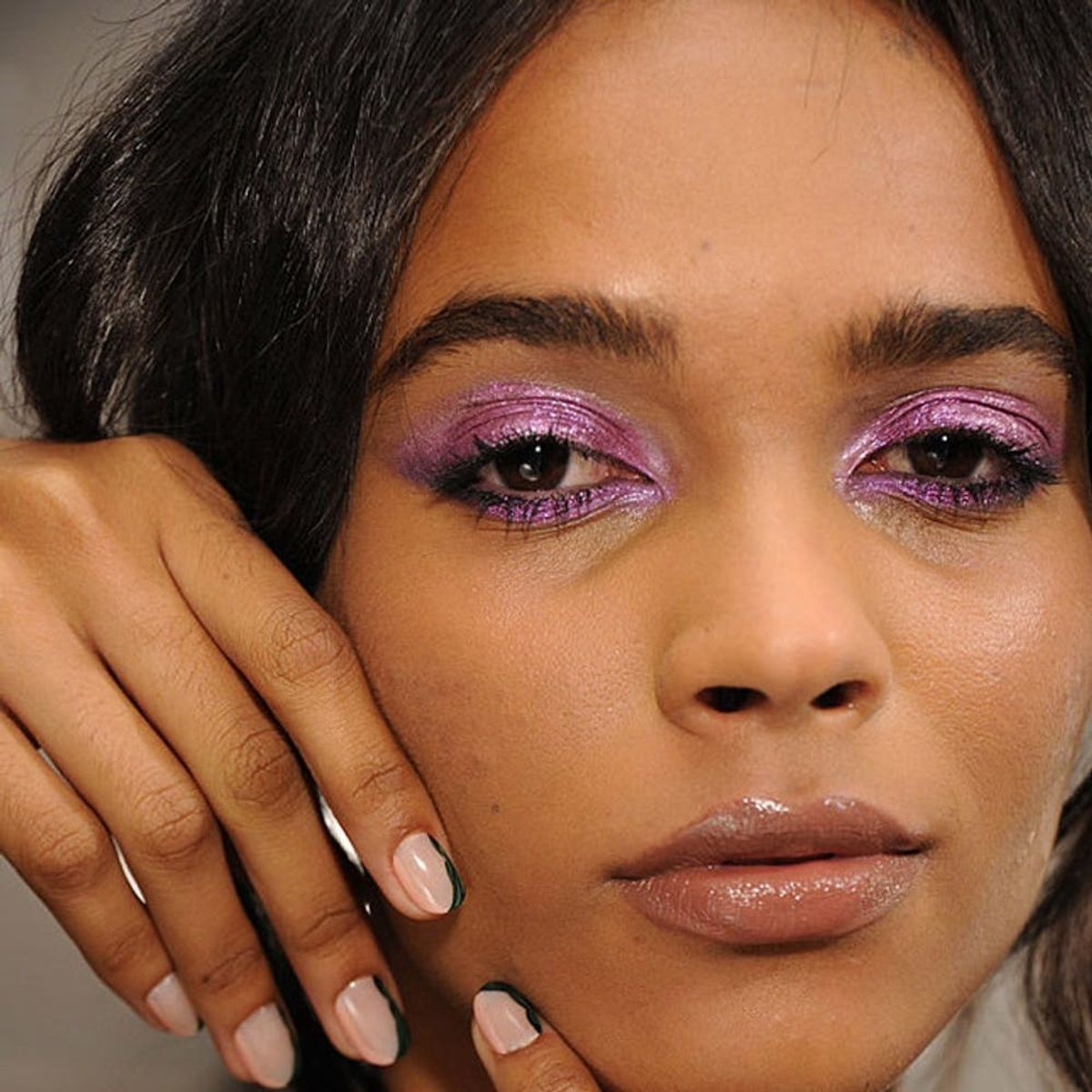 9. Not-So-Subtle Smokey Eye: Alice + Olivia’s beauty look was a hopeless romantic’s dream come true — no doubt thanks to a mix of out-there style and soft, sweet details. We’re swooning over the model’s pixie-dusted lids and color-streaked mani. Start with a white base on the lids to really make the colors pop. (Photo via Jennifer Graylock/Getty)