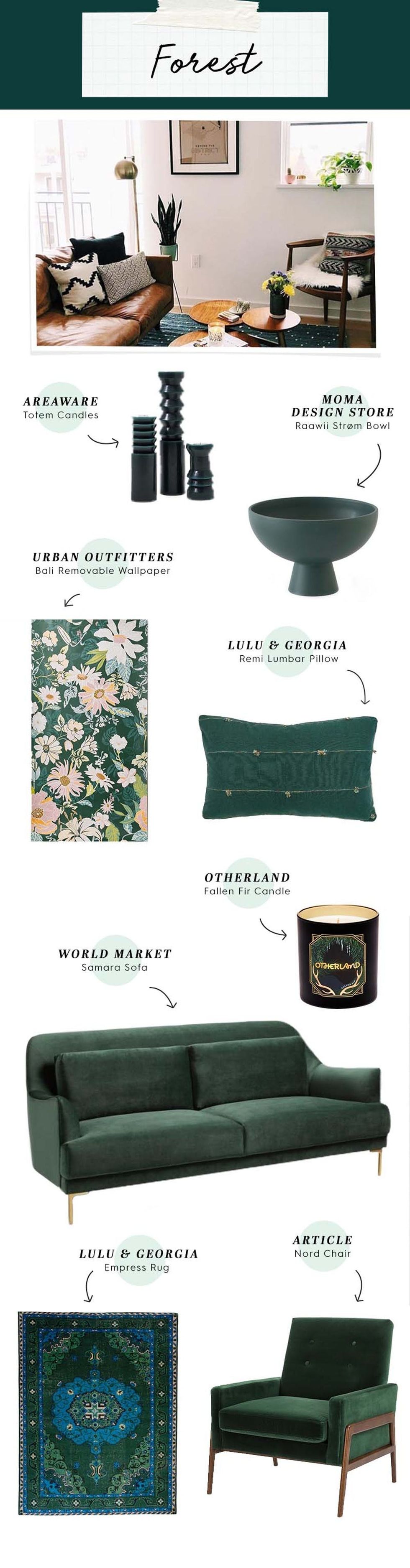 Areaware Totem Candles ($12+); MoMA Design Store Raawii Strøm Bowl ($60+); Urban Outfitters Bali Removable Wallpaper ($49); Lulu & Georgia Remi Pillow ($150); Otherland Canopy Candle ($36); World Market Samara Sofa ($750); Lulu & Georgia Empress Rug ($297+); Article Nord Chair ($599)