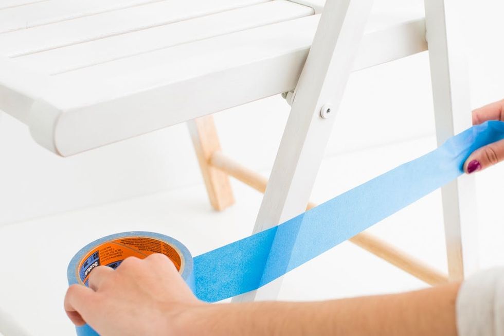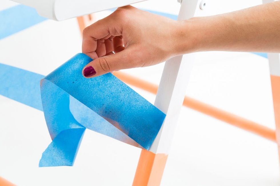 Tape off the bottom half of the chair. Our tape line was about one foot from the bottom of the legs. No need to tape off each chair the same — you can mix and match to create different levels on each leg if you like.
