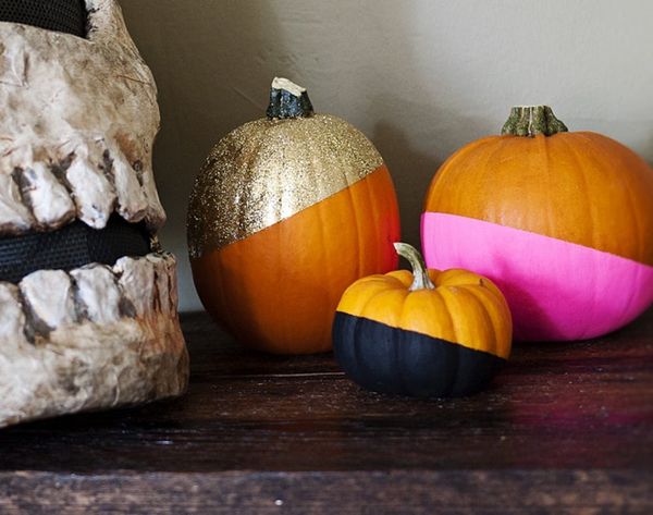 Sometimes carving pumpkins can be a serious chore. Though we appreciate the effort that goes into a well-carved pumpkin, we also love a good hack. Earlier this week we shared our striped and studded pumpkins, and now we’ve got another no-carve trick. Glitzy Color-Dipped Pumpkins!