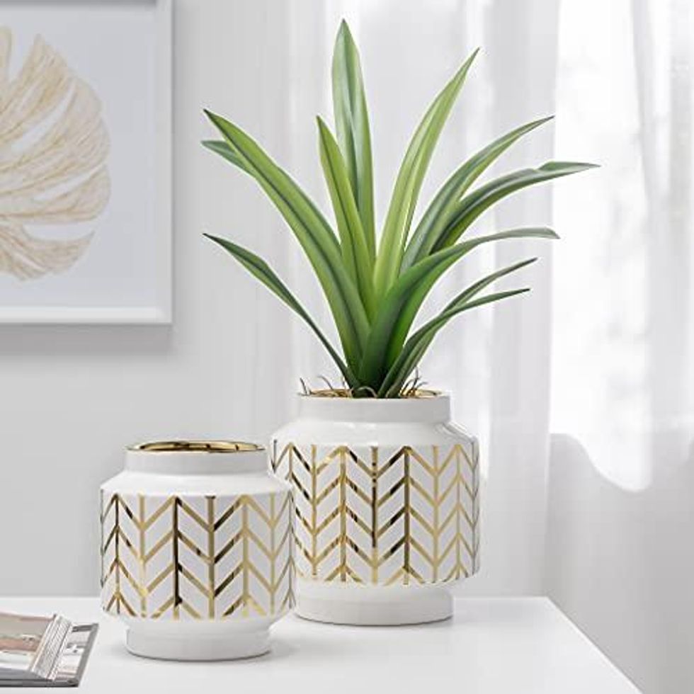 See it on Amazon"Maximize Your Decorating Potential" With A Gold Chevron Stripe Ceramic Cachepot
