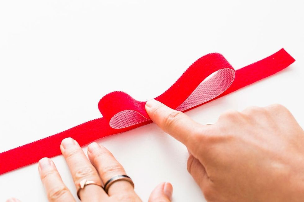 Wrap the small piece of VELCRO® Brand ONE-WRAP around the middle to secure your bow, and then add your bow to a piece of VELCRO® Brand ONE-WRAP that you’ve wrapped around your gift.