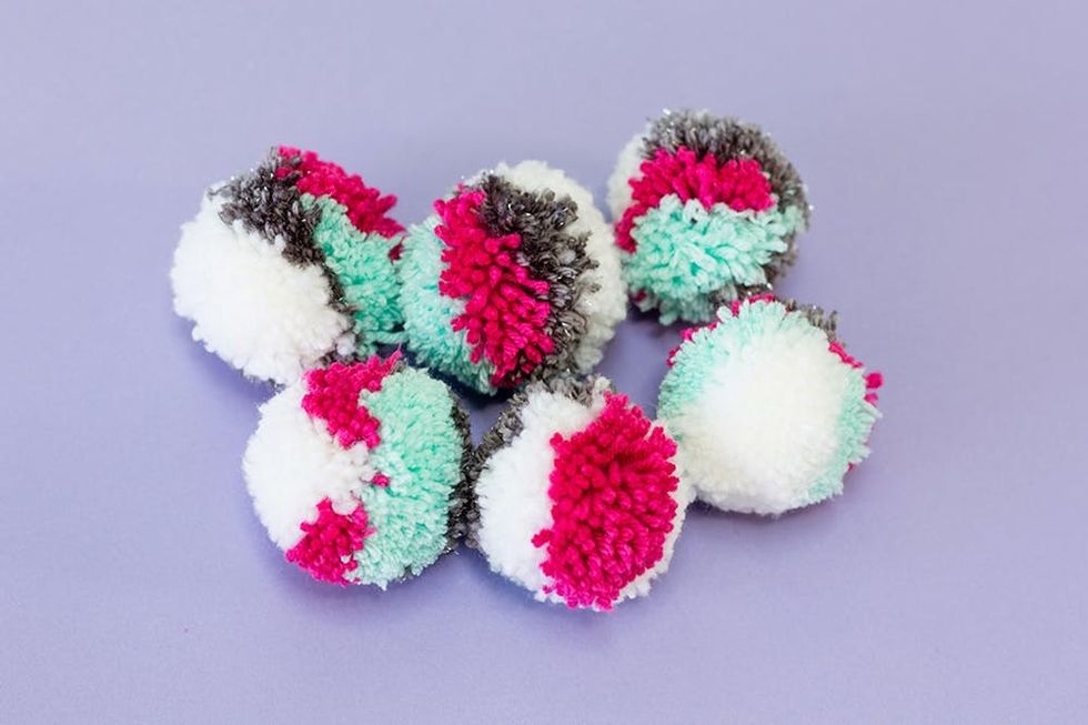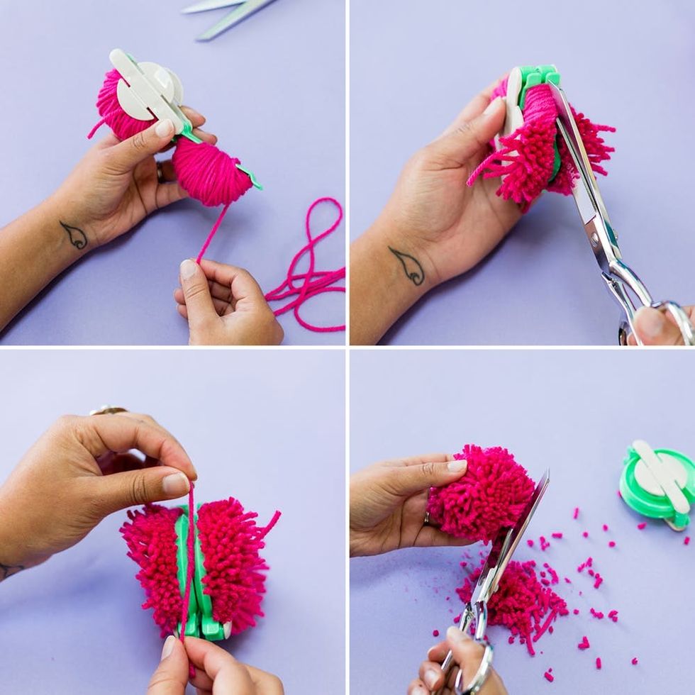 - Use a pom-pom maker to create a ton of pom poms. I recommend creating a whole bunch of pom-poms and then seeing how much space they fill. Then you can estimate how many more you need to make.