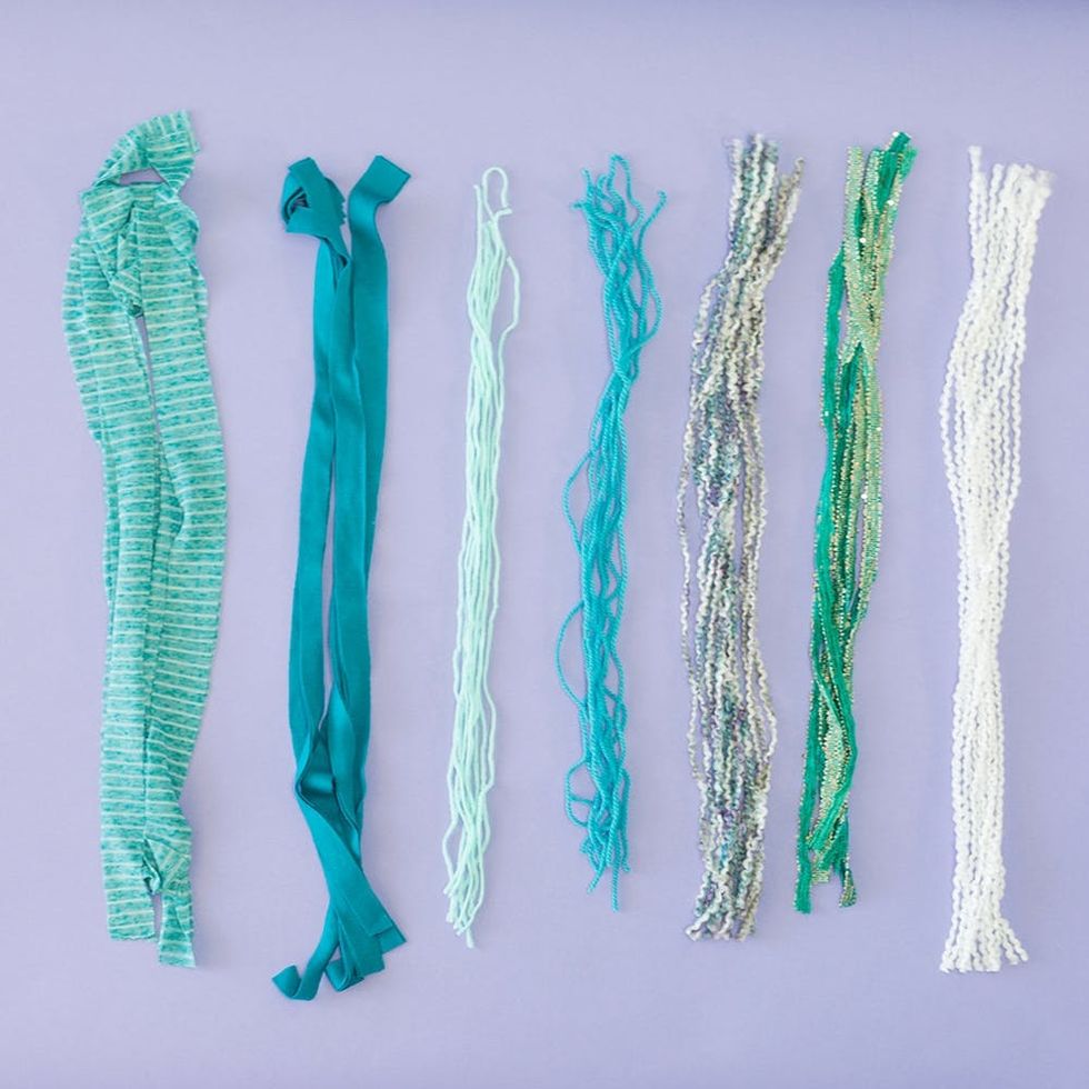 - Arrange all of your “ingredients” almost like a salad bar or buffet! Then assemble your first tassel. Drape it over the hanging yarn, then use another piece of yarn to tie it on.