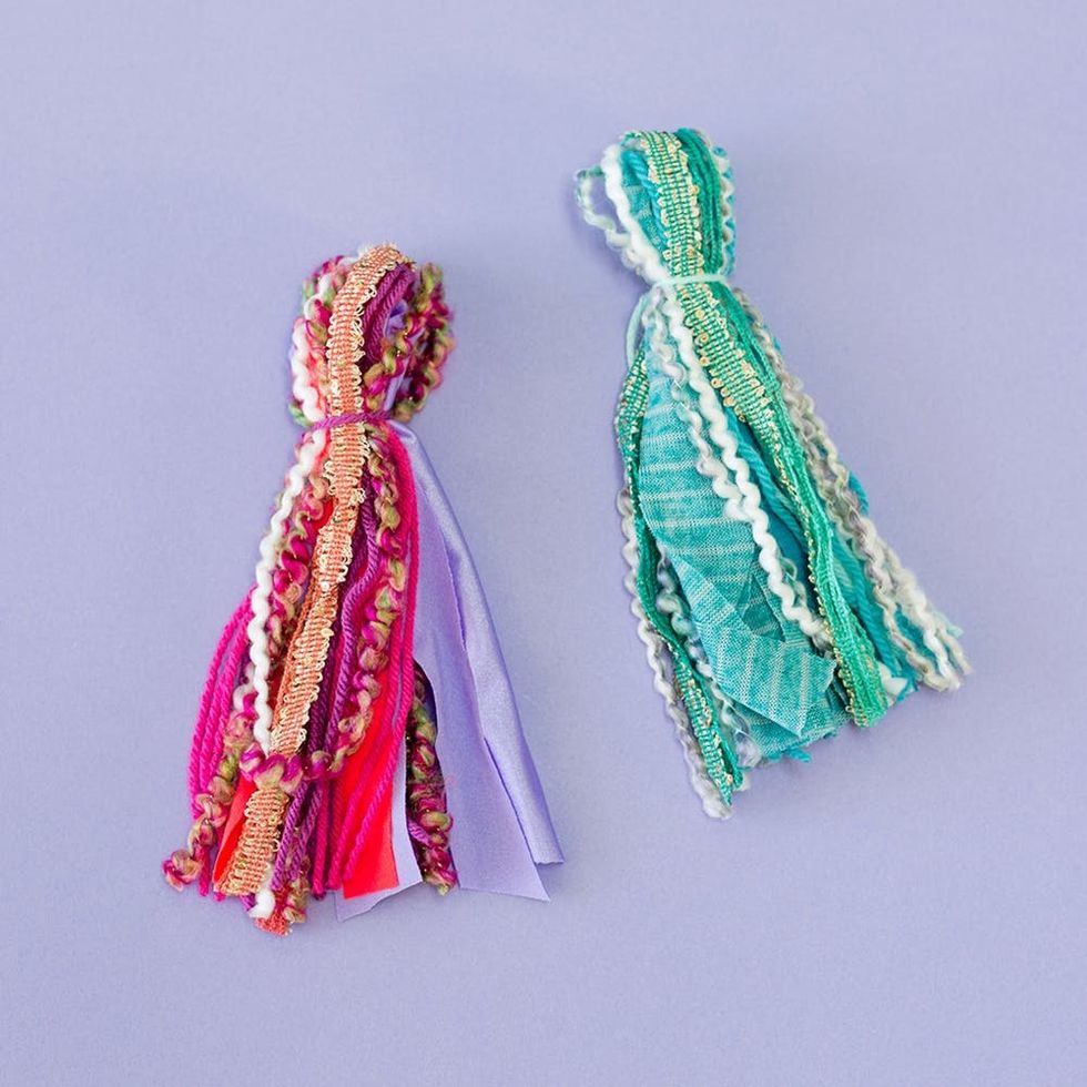- Decide what type of tassels you want to make. I decided to make two color-ways, one pink and purple and one predominantly blue. Choose materials based on your palette.