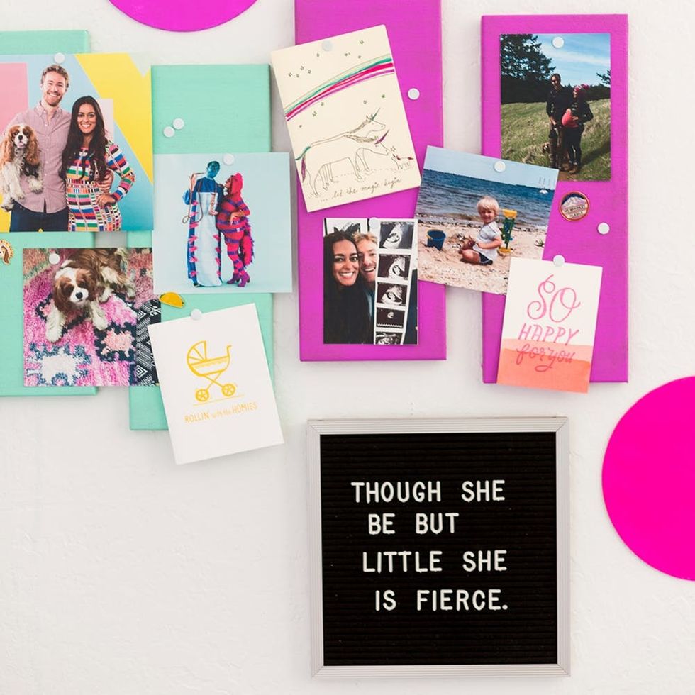 I found the skinny cork boards you see in the photo above, but you can also cut a roll of cork board to create whatever shapes you like. Paint, let dry, paint another coat, let dry, and so on. Then hang on the wall. Done and done!