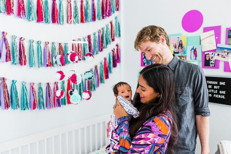 Anjelika Temple here, Chief Creative Officer at Brit + Co and brand new mom to little Miss Anokhi Paranjpe Temple! During the weeks leading up to the arrival of my little one, I nested hard. I did weird things like re-organize the freezer and I did things that are actually helpful like sorting her clothes by size. And obvs I DIY’ed my little heart out to make her nursery a cozy and colorful space, albeit a small one. I teamed up with Jo-Ann to create four pieces of DIY decor that can easily be personalized to fit any nursery vibe. Read on to see what I made and how it all came together. (BTW, shout-out to Anokhi Temple for knocking out her first photo shoot at exactly two weeks old!)