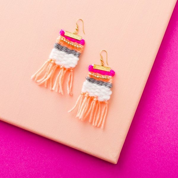 If you’ve been anywhere on the interweb in the last month, it’s likely that you’ve heard that our line of Brit + Co DIY Kits has popped up at Target stores and on Target.com. YAY! From the Metal Stamp a Necklace Kit to the Gold Foil Tote Kit, these babies have been *flying* off the shelves. Rest assured, while you may have already bought all the kits and made all the DIYs, we’re sure that you’ve got some leftover materials to make more. With this tutorial, we’re going to dive into a kit-eration of the Weave a Necklace Kit — turning some of that leftover yarn into a pair of colorful earrings, assuming you’ve already been rocking your necklace :)