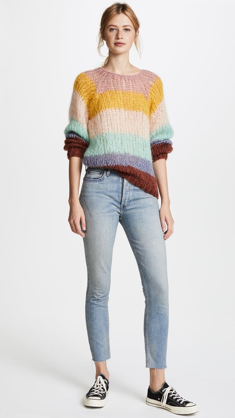 Same ol’ black turtleneck that’s been on repeat, you’ve officially been banished to wherever you came from. This next style-influencer-approved winter essential will almost make you crave six more weeks of winter (and we’re not just saying that because of Punxsutawney Phil). Embrace your inner unicorn with a colorfully striped sweater that pairs well with everything in your wardrobe (we’re talking: raw hem jeans, boardroom trousers, and tough-girl leather minis). Keep scrolling for 14 Insta-perfect striped sweaters that are on the verge of becoming your new closet MVP.