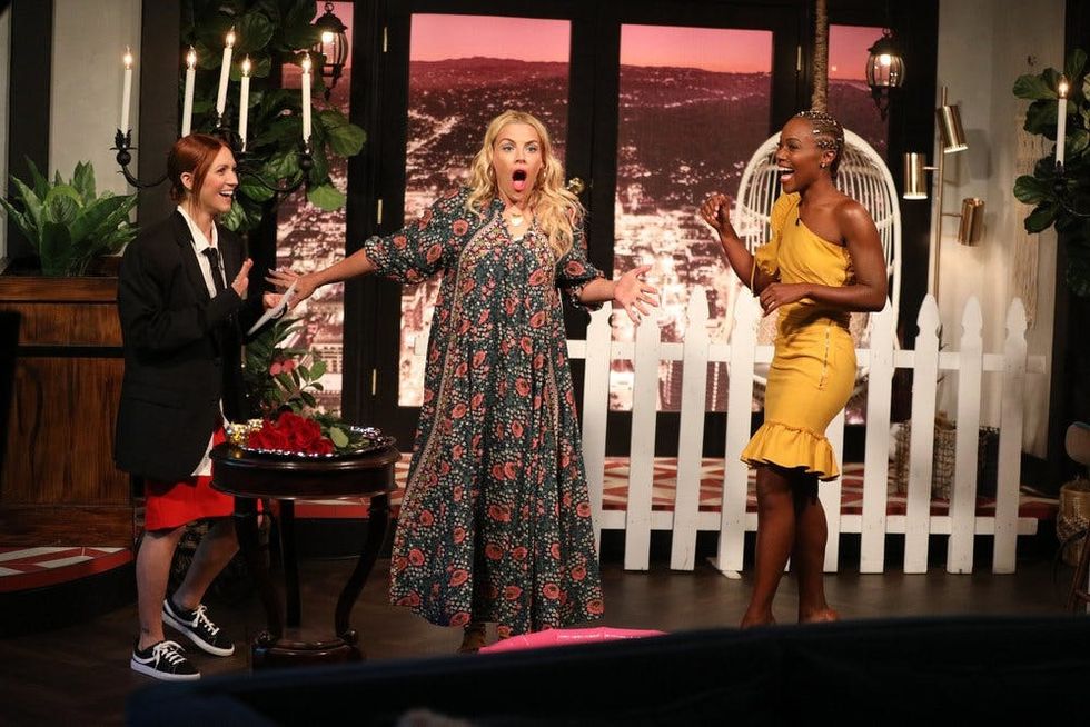 Cut to Wednesday’s episode of Busy Tonight, when host Busy Philipps welcomed Someone Great costars DeWanda Wise and Brittany Snow, the latter of whom is a big Bachelor fan. In honor of Snow’s appearance, Philipps added some special Bachelor-esque touches — like a mini inflatable “hot tub,” a toy helicopter, and a table full of roses — to her set.