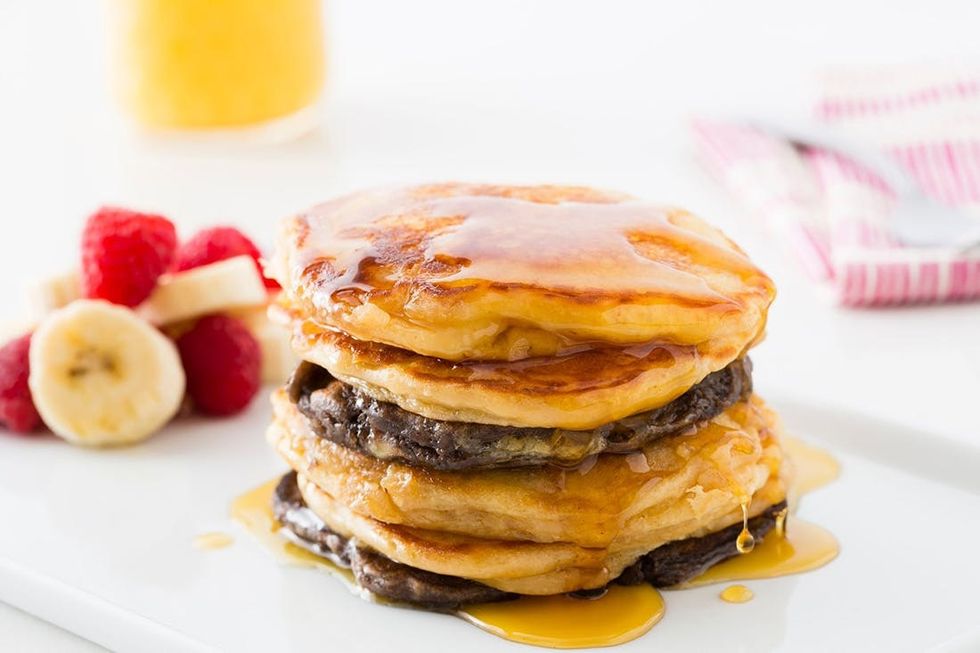 - Stack your pancakes. Drizzle with syrup and serve with fresh fruit. Dig in!