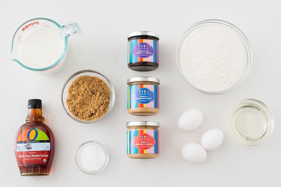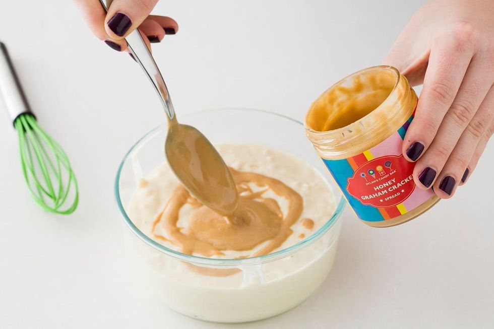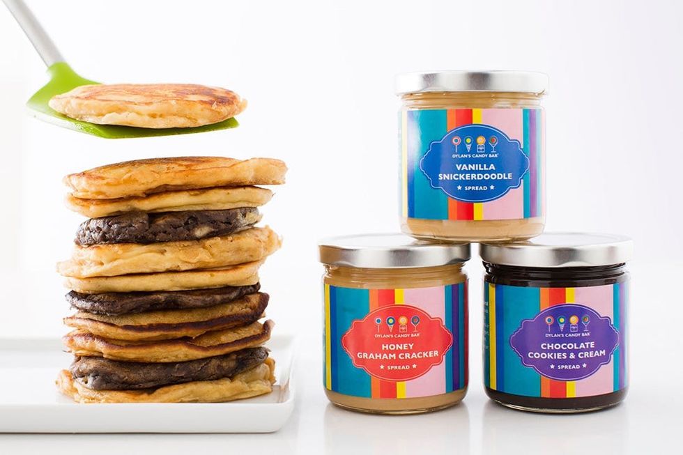 - Divide the pancake batter into three bowls. Add 1/4 cup of Dylan’s Candy Bar Honey Graham Cracker Spread to the first bowl. Stir to combine. Add 1/4 cup of Dylan’s Candy Bar Vanilla Snickerdoodle Spread to the second bowl. Stir to combine. Add 1/4 cup of to the third bowl. Stir to combine.