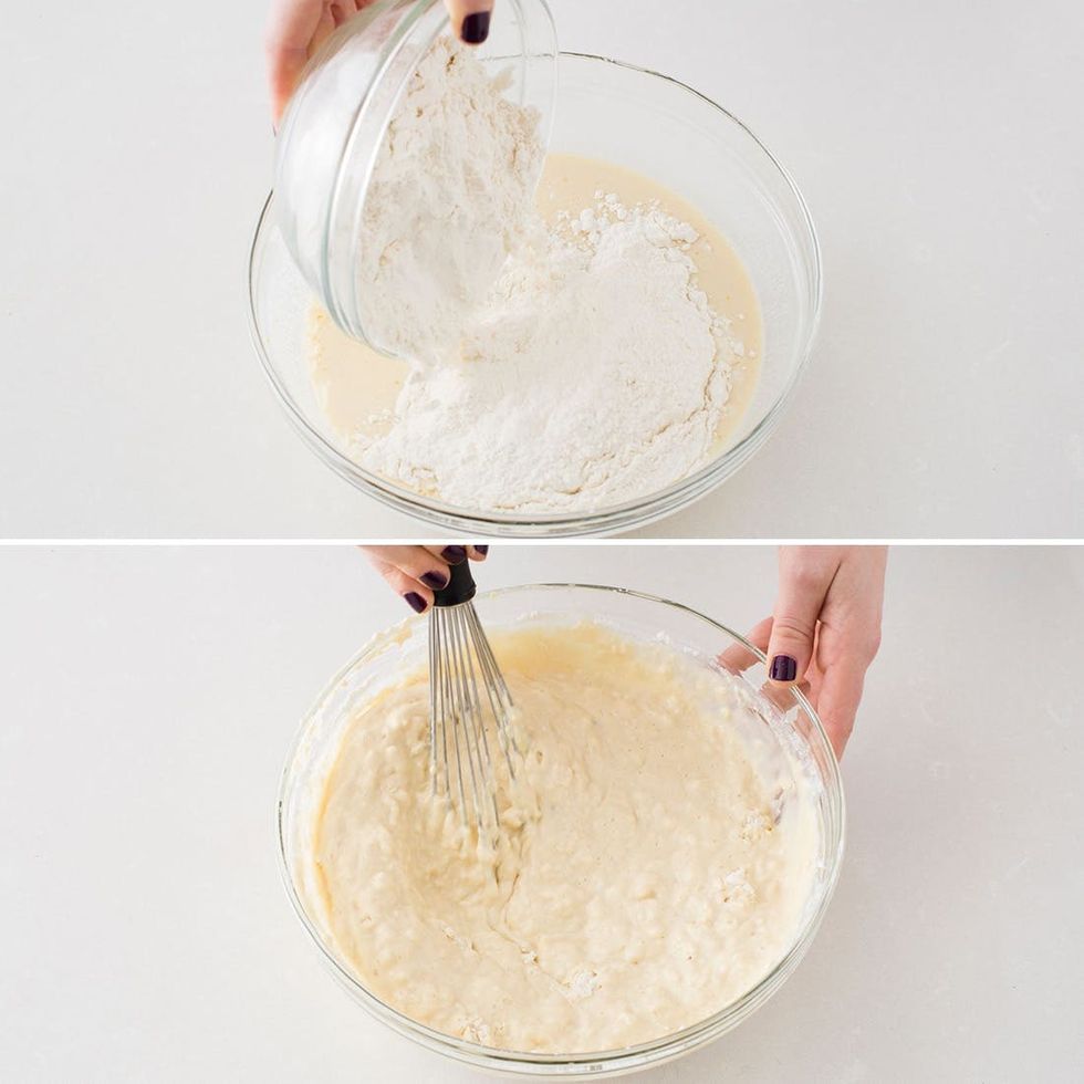 - In a large bowl, combine the buttermilk, eggs, vegetable oil and brown sugar. Whisk. Add the flour, baking powder and salt. Mix to combine.