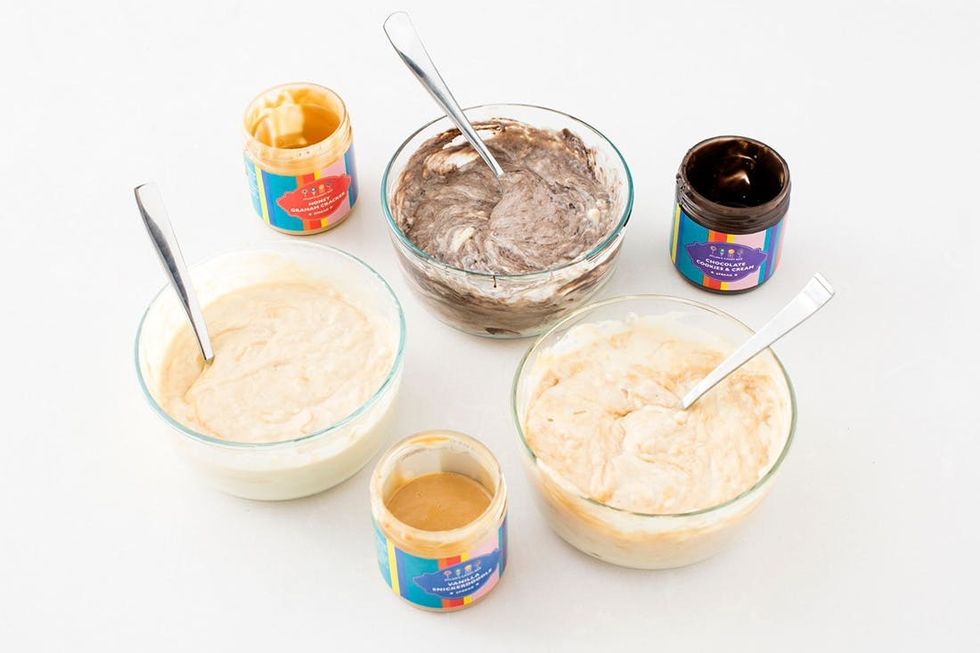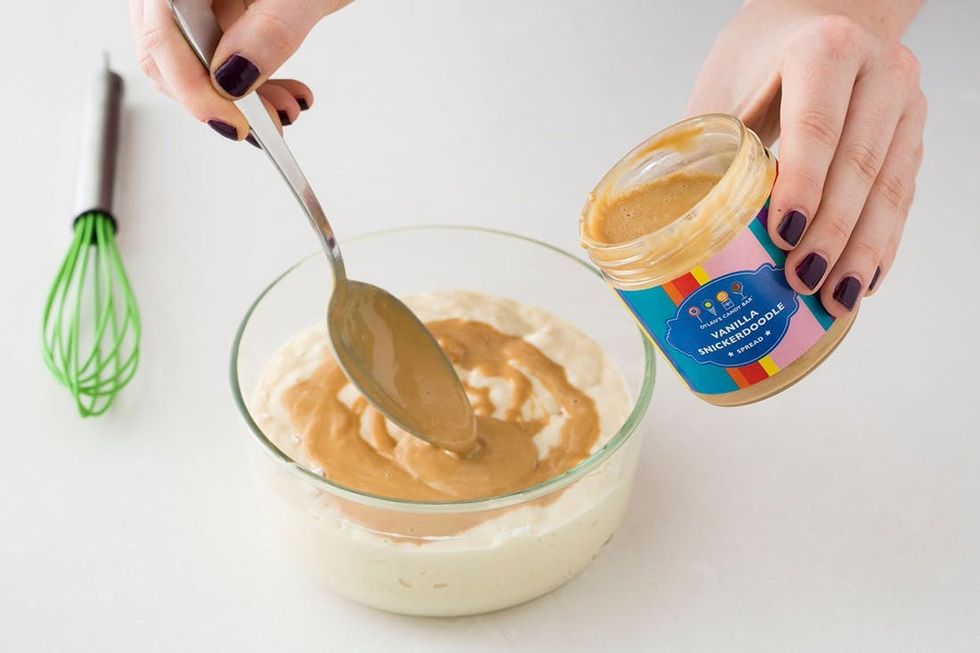 Add 1/4 cup of Dylan’s Candy Bar Vanilla Snickerdoodle Spread to the second bowl. Stir to combine.
